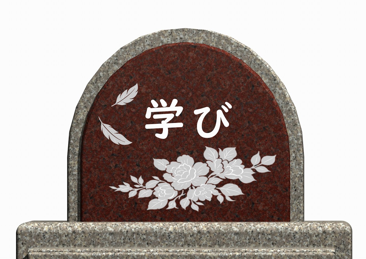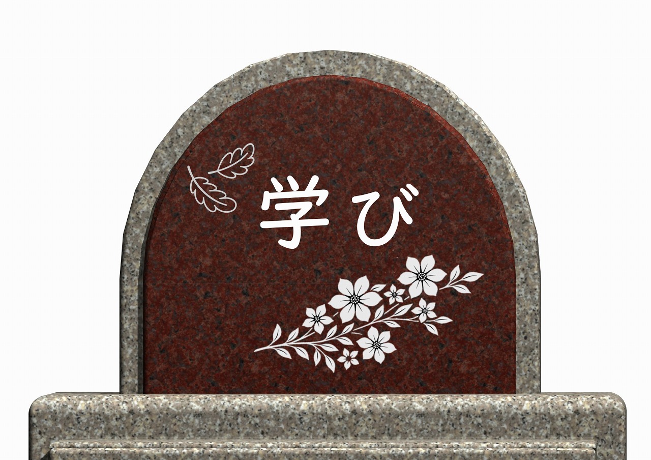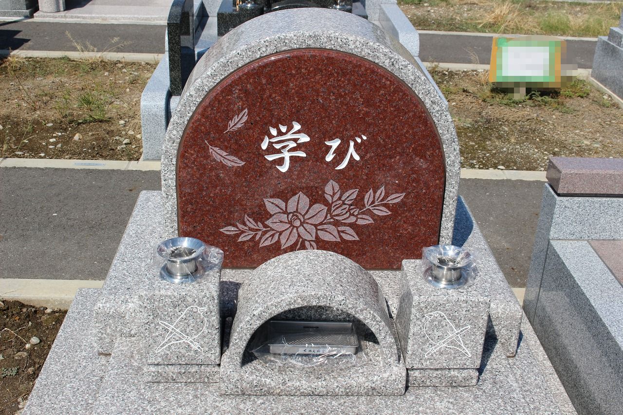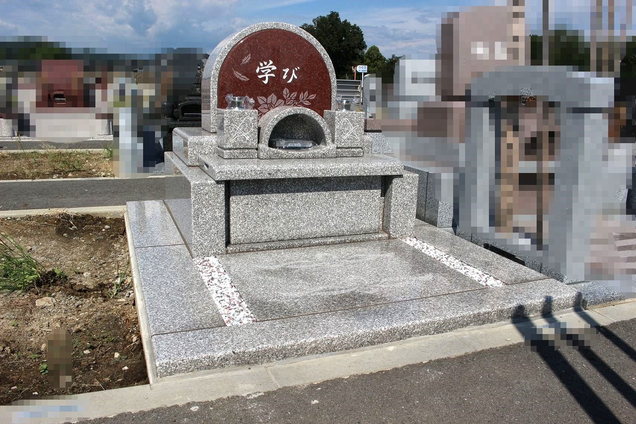 • 付属品の設置: 墓誌、香炉、花立、水鉢といった付属品を配置します。写真のお墓は、丸みを帯びた棹石に「学」の文字が刻まれた、モダンなデザインです。