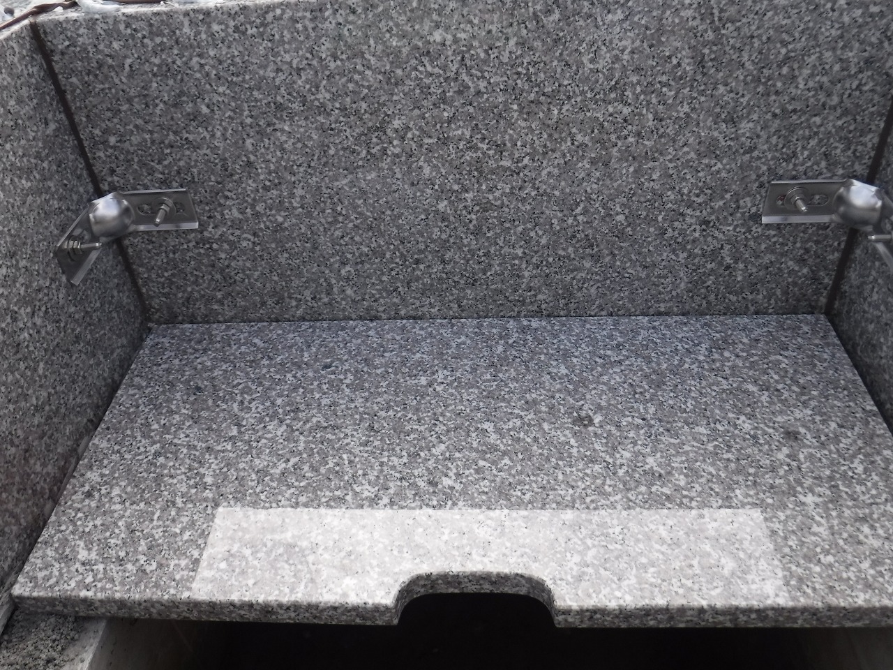• カロートの完成: 基礎の開口部を囲むように、石材でカロート(納骨室)が形成されます。このカロートは、遺骨を守る重要な部分です。石材同士の接合には、強度と耐久性に優れた免震・耐震用のボンドやL字金具を使用し、地震対策を施します。