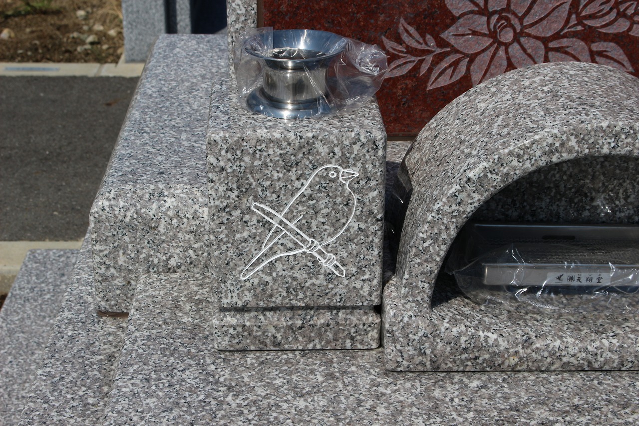 群馬県高崎市若田町 高崎市八幡霊園66区にて、ご家族で考えた鳥などの彫刻を施した、ピンク系の可愛らしい洋型墓石が完成しました。