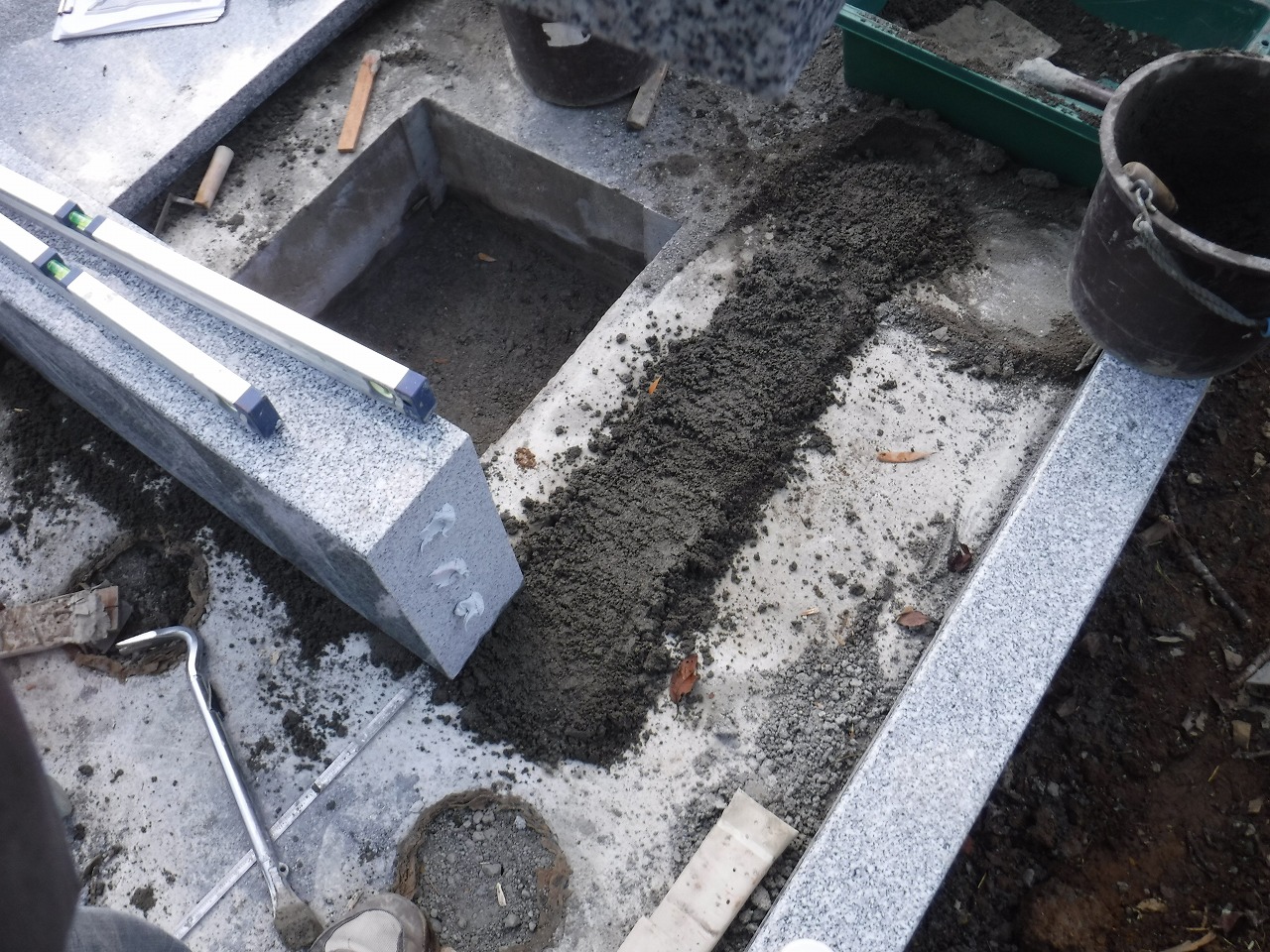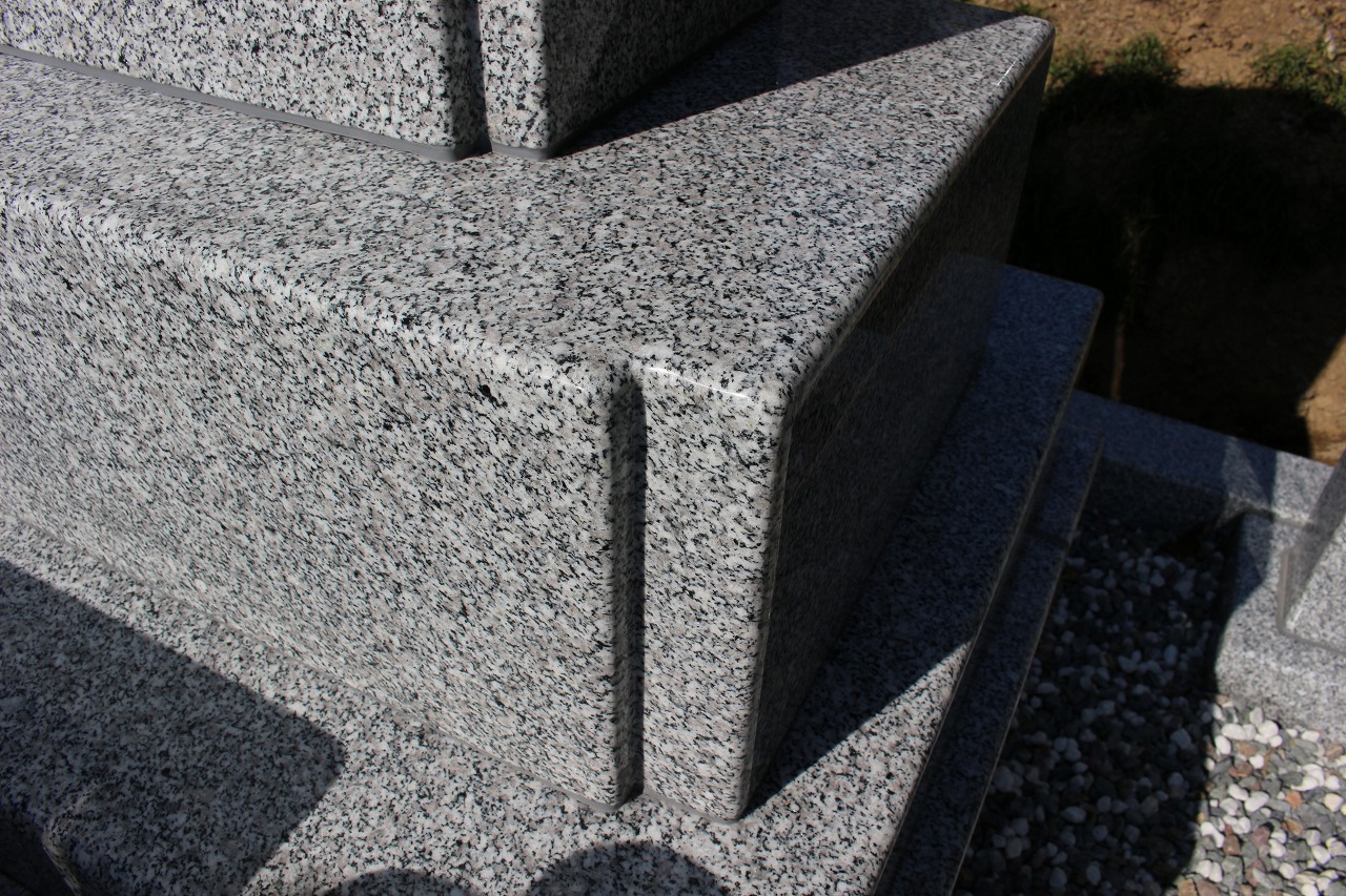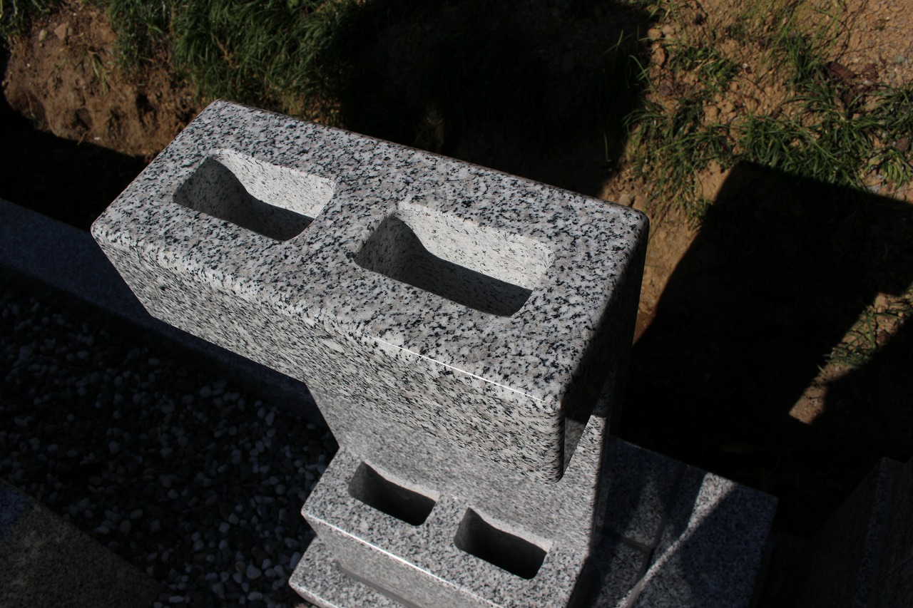 基礎が固まった後、いよいよ美しい石材を組み上げていきます。今回使用した、繊細で気品のある白御影石が、周囲の光を反射し、清々しい空間を生み出します。