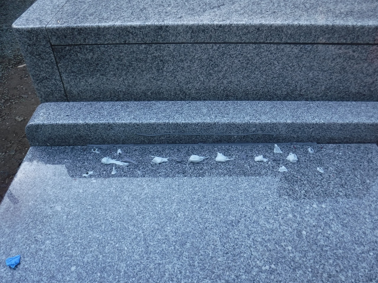 • 青いテープは、石材同士を接着する際に、余分な接着剤(コーキング材)がはみ出て、石の表面を汚してしまうのを防ぐための「養生」です。