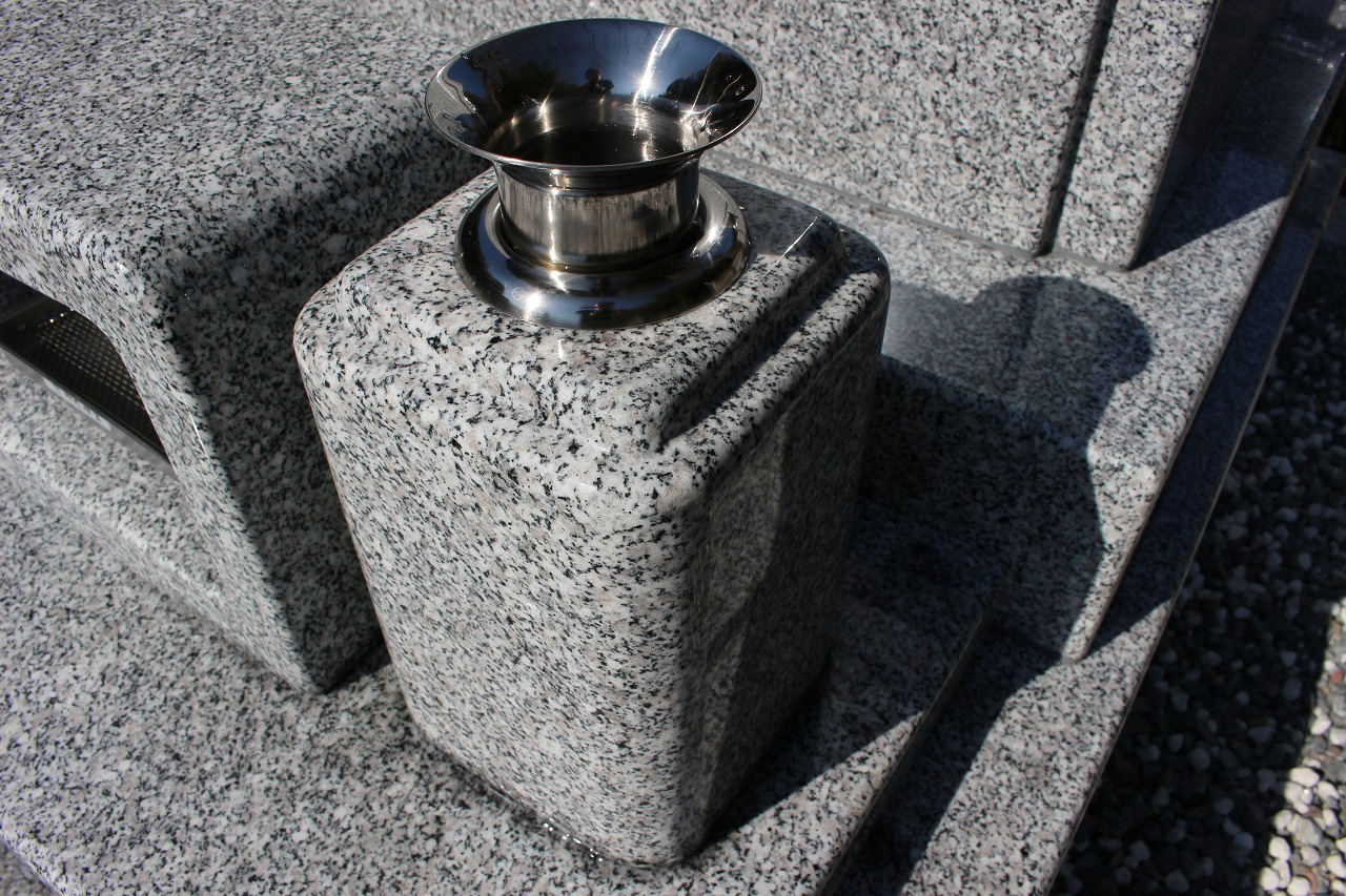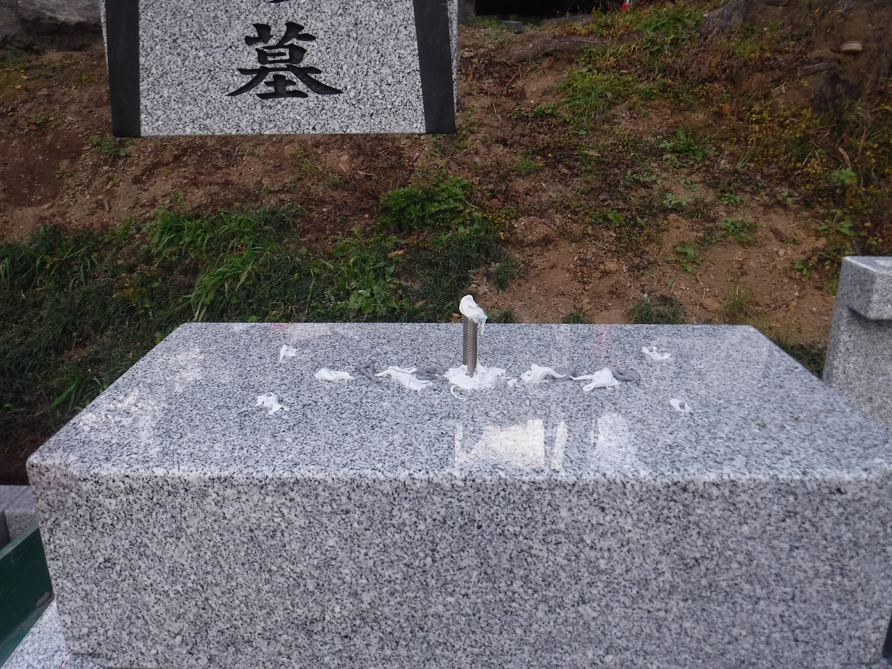 • この石碑を、下の台座へ設置する際には、雨風や地震の揺れから守るため、台座に空けられた穴と石碑の底に埋め込まれたステンレス製の心棒でしっかりと固定します。