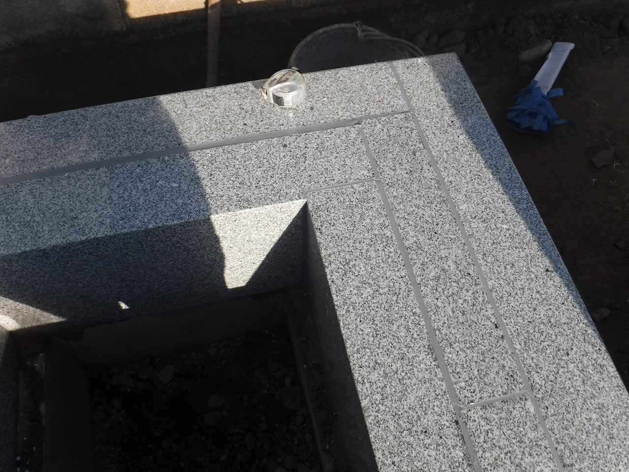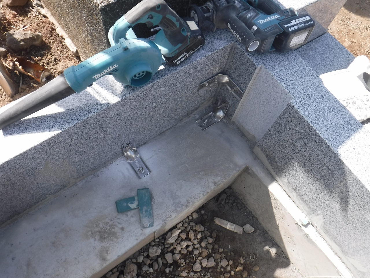ここで当店の「こだわり」が光ります。石と石の継ぎ目には、強力な石材用接着剤を使用するのはもちろんのこと、内側からステンレス製のL型補強金具をボルトでしっかりと固定します。