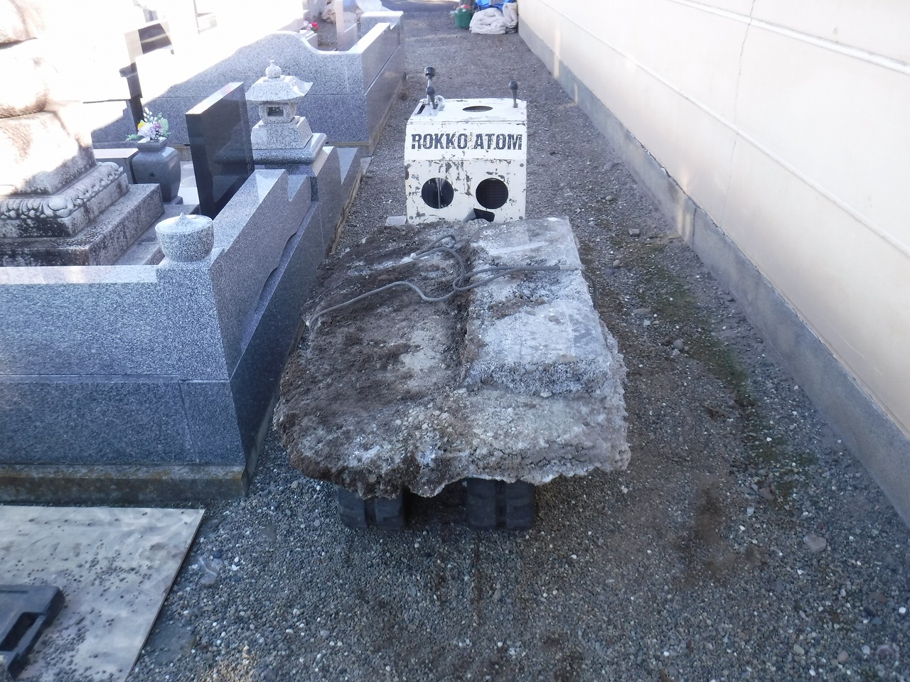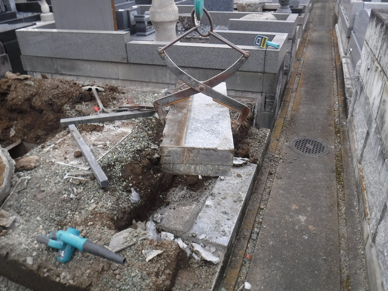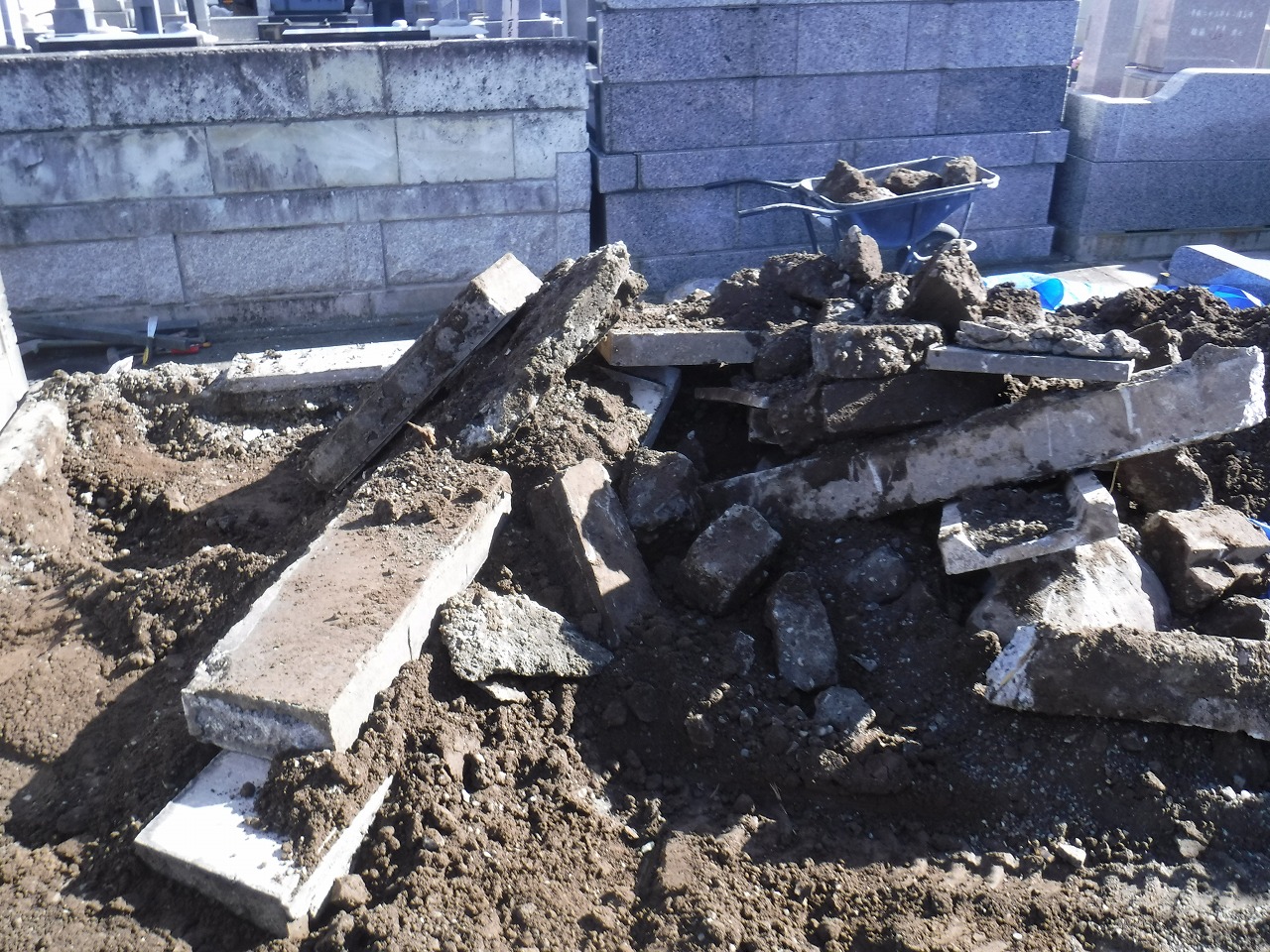 目に見える墓石を取り除いた後は、お墓を囲っていた「外柵(がいさく)」や、その下の「コンクリート基礎」の解体に移ります。