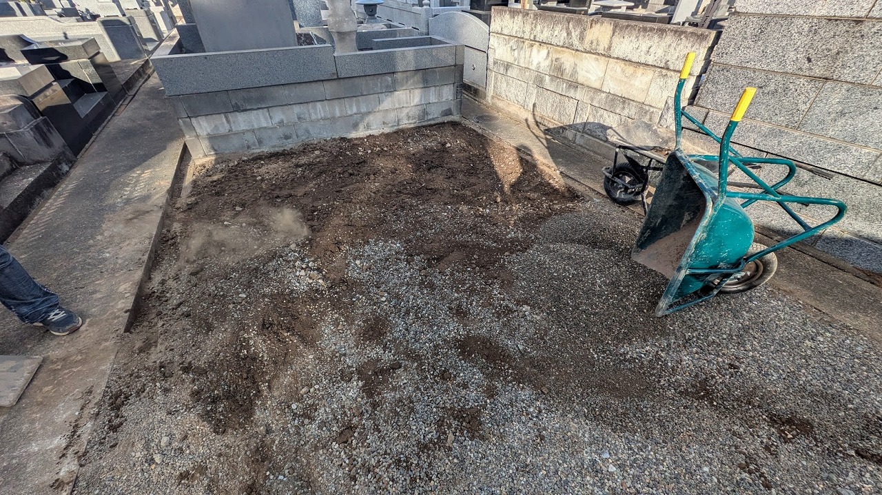 すべての石材と基礎を取り除き、新しい土(真砂土など)を入れて平らに整えます。