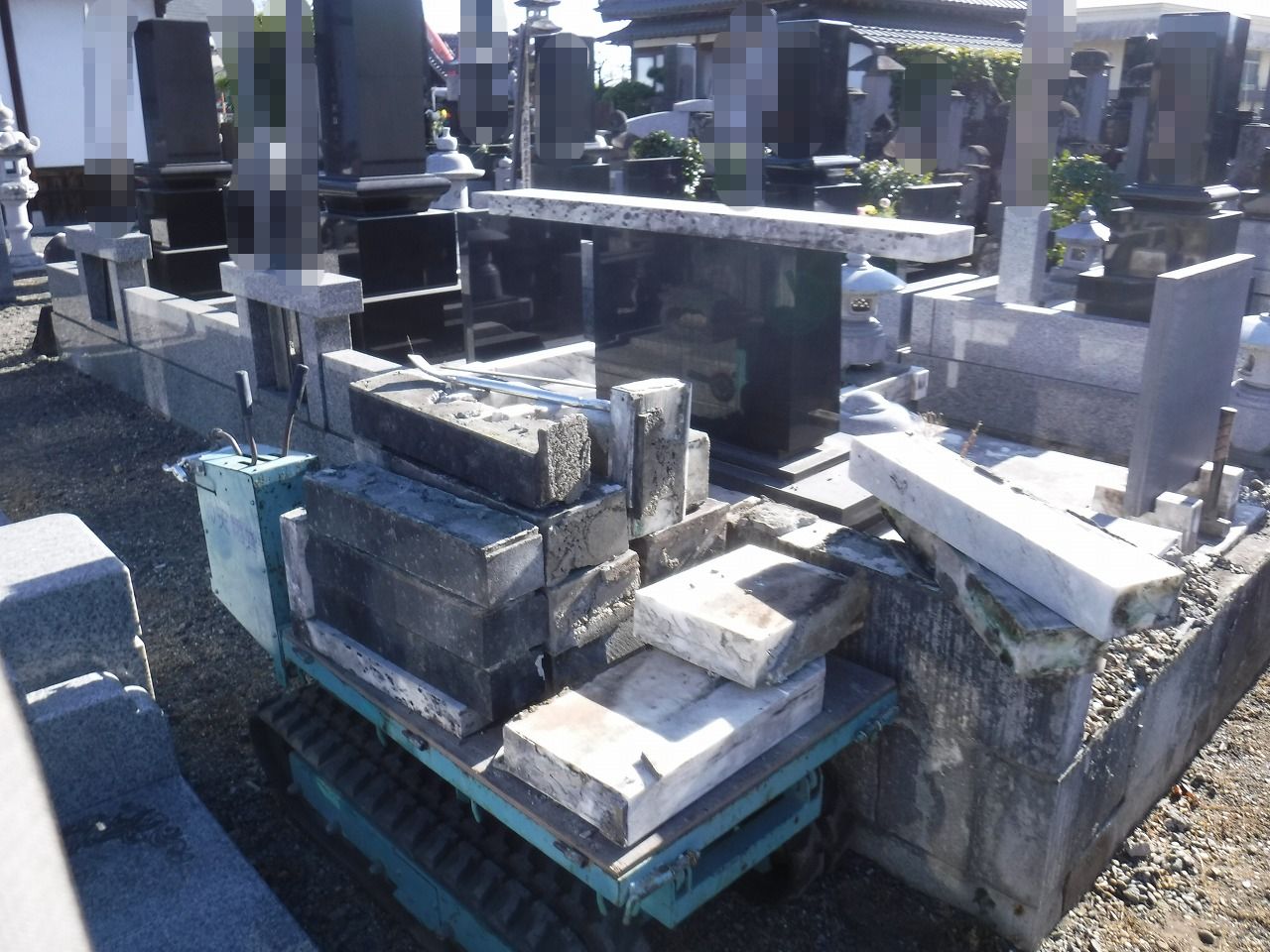 墓石を慎重に取り外し、運搬車へと積み込んでいきます。