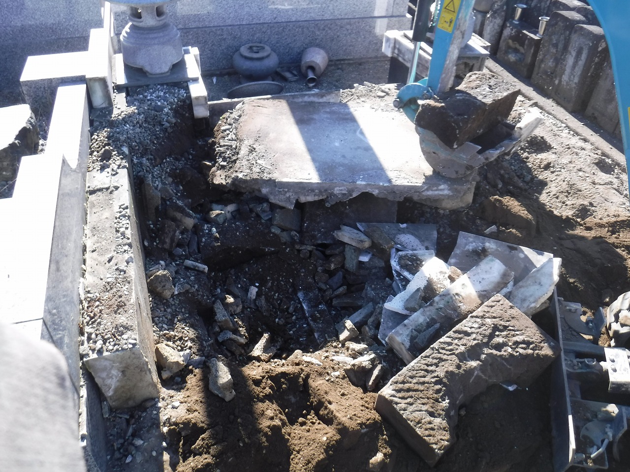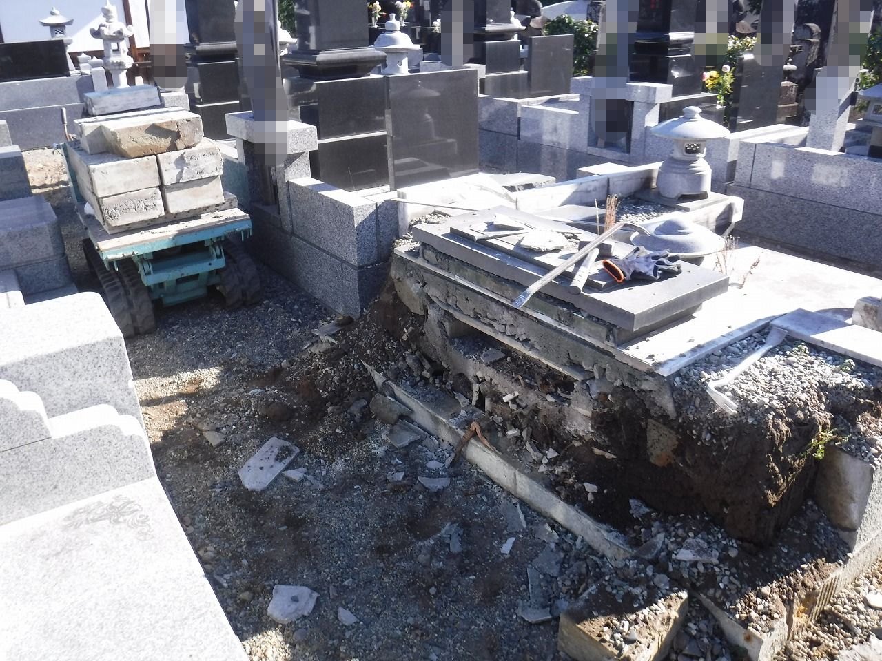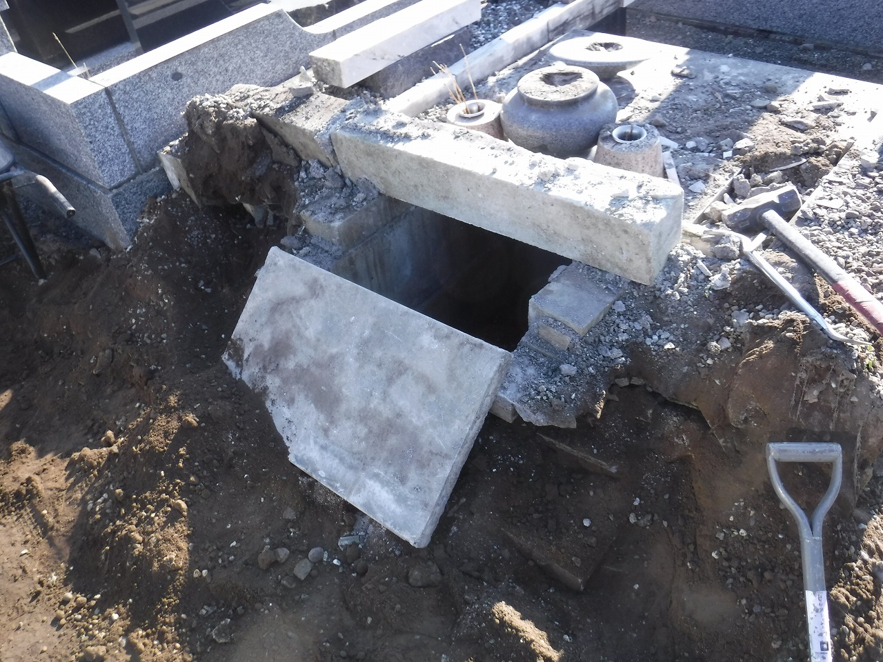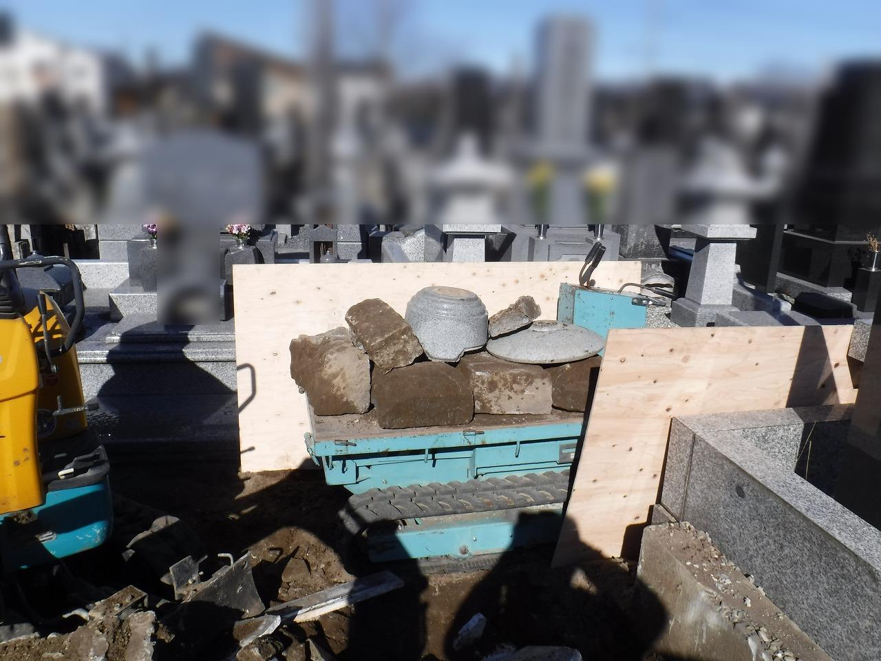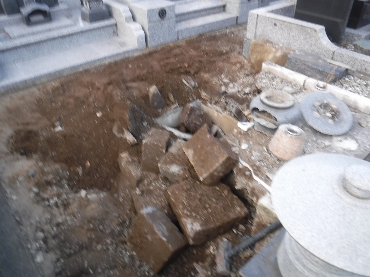 墓石本体の撤去が終わると、土台となる石積みや外柵、そして納骨室(カロート)の解体へと移ります。 お墓の構造は、地上に見えている部分よりも、地下の基礎部分が非常に頑丈に作られています。