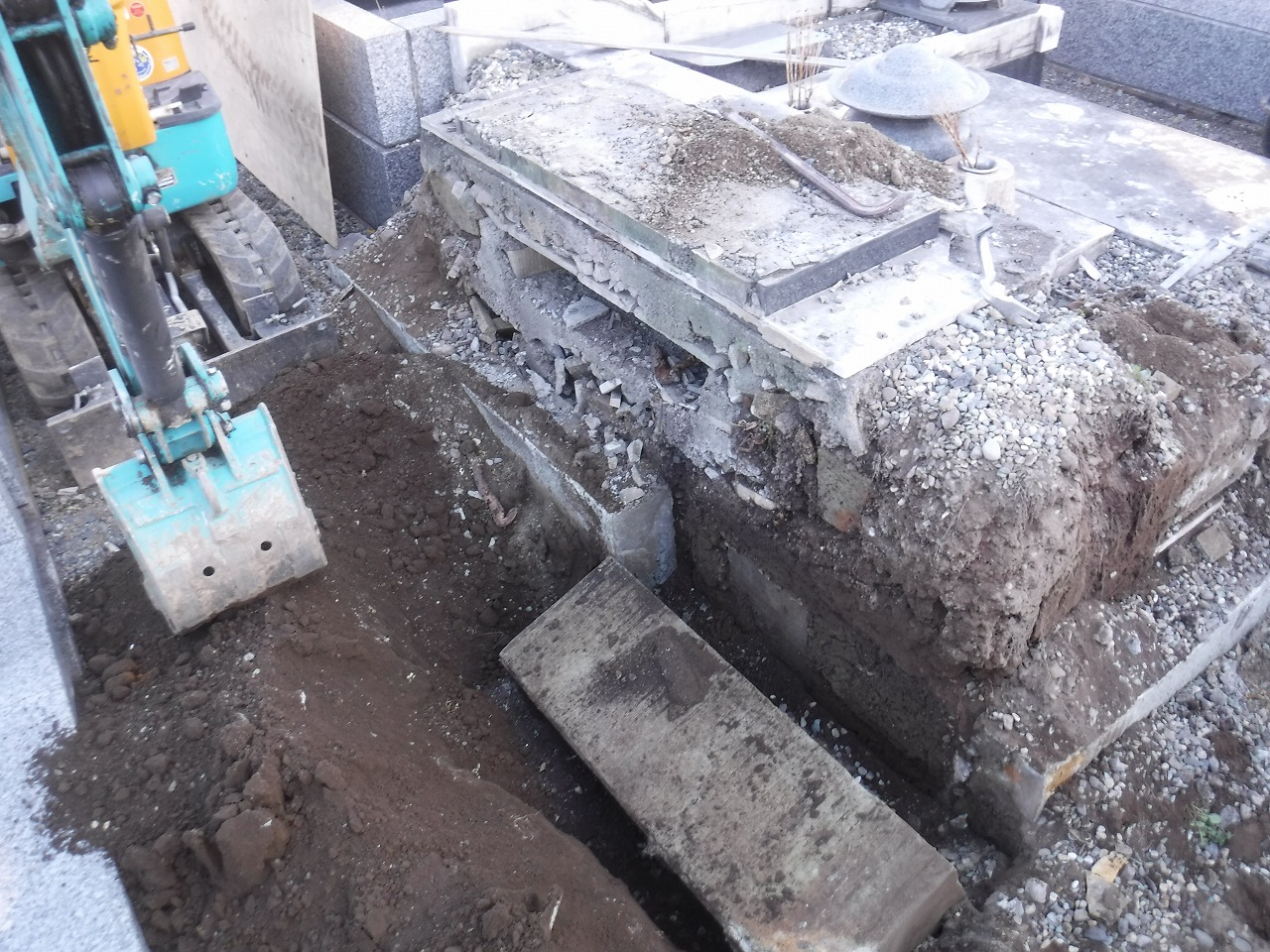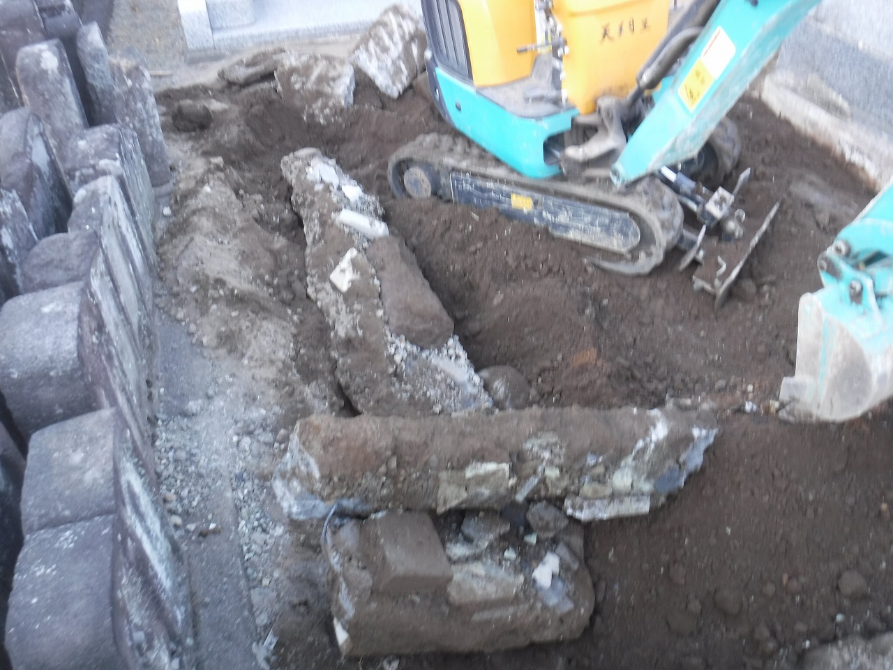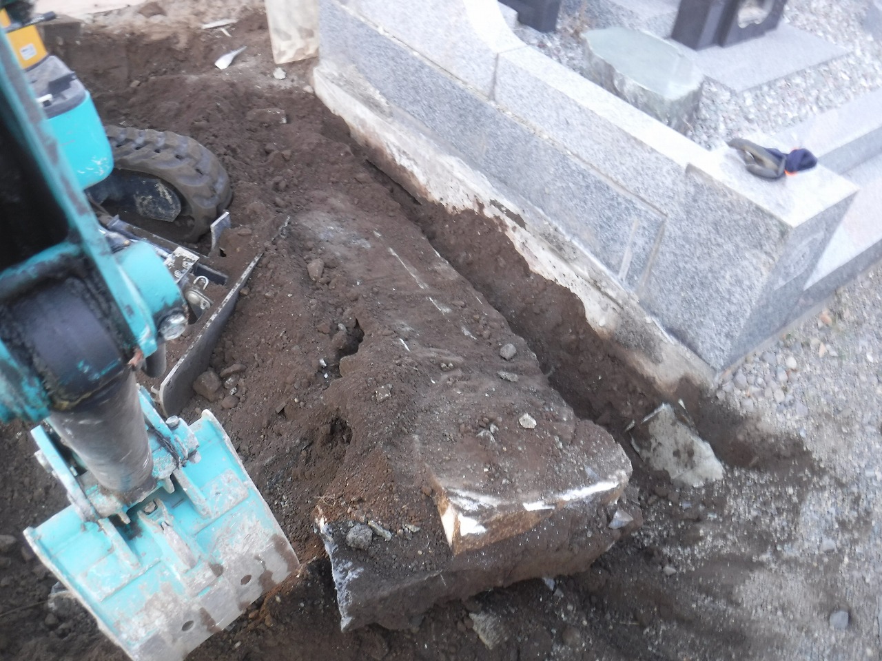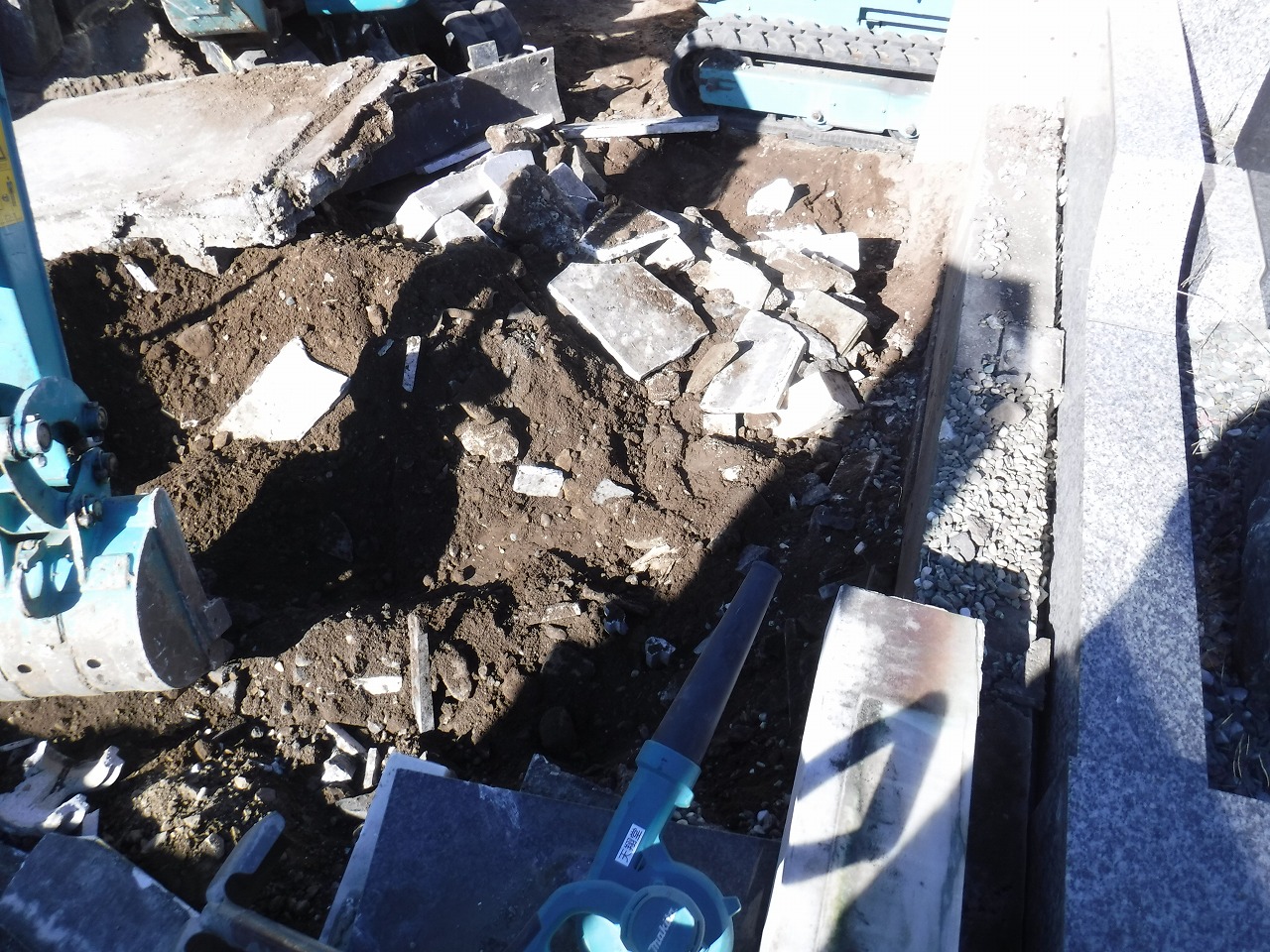 - 工事経過の様子: 写真をご覧いただくとわかる通り、重機(バックホー)も導入し、地中に埋まったコンクリート基礎や古い石材を一つひとつ掘り起こしていきます。長年、重い墓石を支えてきた強固な基礎も、熟練の技術で確実に撤去していきます。
